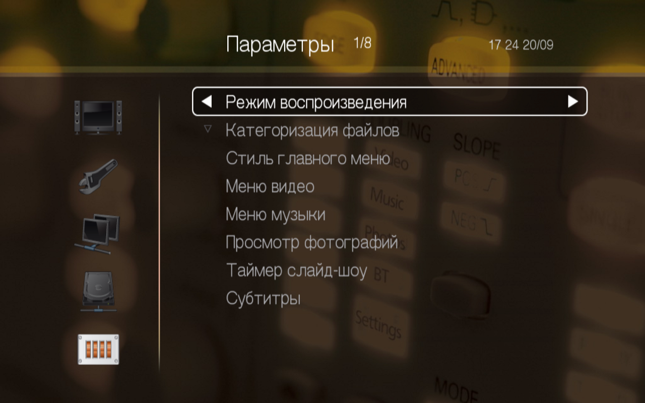 На последней странице находятся различные дополнительные параметры, влияющие на собственно работу с медиафайлами. В частности, настройки повтора и порядка отдельно для фото, музыки и видео, режимы работы с тегами (автоматическое или ручное создание каталога на локальных и сетевых ресурсах), вид главного меню (можно использовать слайдшоу или видео), отображение категорий для видео и музыки, режим показа фотографий, параметры слайдшоу, настройки субтитров. Для последних можно выбрать размер, положение и цвет.