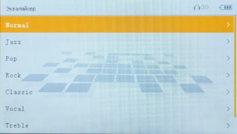 Есть и обычный эквалайзер, но он представлен только несколькими предустановленными режимами, а ручной настройки, к сожалению, нет. Нет и никаких других настроек аудиопроигрывателя, кроме перечисленных.