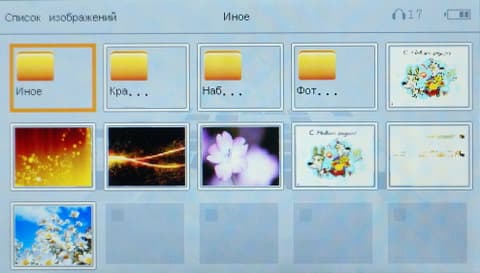 Список картинок представлен в виде превьюшек, по которым можно быстро составить представление о фотографии. Из опций просмотра поддерживается увеличение, уменьшение, поворот, слайд-шоу. Картинку можно установить как фон главного меню. В остальных местах (браузере файлов, видео- и аудиоплеере и в других режимах работы) всегда стандартная серая фоновая картинка.