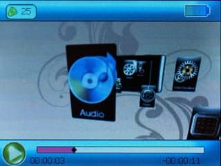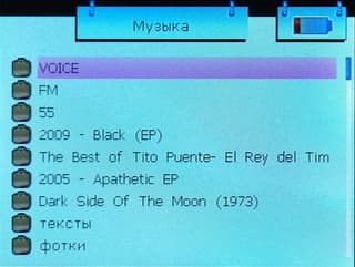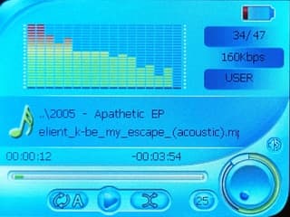 Устройством поддерживается скромный набор аудиоформатов: MP3 и WMA (DRM9). Воспроизведение музыки начинается сразу же, как только мы выбираем режим меню «Музыка». Во время воспроизведения на дисплее отображается довольно много информации. Самая полезная: заряд аккумулятора, битрейт аудиофайла, режим эквалайзера, название композиции, время, прошедшее с начала и оставшееся до конца воспроизведения, громкость звука в числовом и графическом представлении. Наряду с этими сведениями отображается также: графическая визуализация эквалайзера, порядковый номер аудиофайла относительно их общего количества в памяти, путь к файлу, режимы повтора и воспроизведения в виде значков, которые с первого взгляда довольно загадочны и неинформативны.