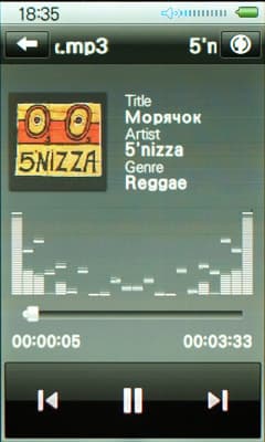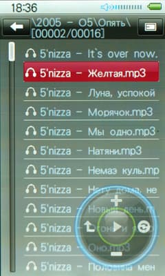 Далее на экране отображается еще одна полоска. В ее центре бегущей строкой пишется имя файла. Слева от него стрелка, нажав на которую можно попасть в главное меню. Для этих же целей служит и механическая кнопка на лицевой части. Справа же находится иконка, нажатие на которую вызывает браузер музыки. Иконка эта не простая, а с сюрпризом: если нажать на нее быстро, открывается браузер файлов, если не отпускать палец/стилус в течение пары секунд, откроется библиотека на основе тегов. Нестандартное, странноватое, но вполне имеющее право на жизнь решение.