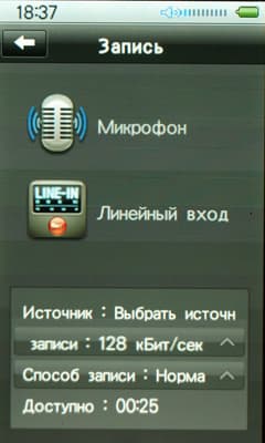 В этом меню скрывается диктофон и функция записи с линейного входа. Там же настраивается и битрейт для записи с радио. Суть процесса достаточно проста: вы выбираете качество в широком диапазоне от 32 до 256 кбит/с, выбираете источник записи — микрофон или линейный вход, способ записи — «Запись с CD», «VOR» или «Норма».