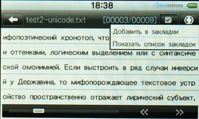 «Читалка» никакими изысками не отличается. Способна открывать файлы формата TXT, текст прерывается в конце строки, настроек никаких не предусмотрено. Всего на дисплее присутсвует 5 строчек, на полный экран развернуть нельзя. В отличие от музыкального и видеопроигрывателя, можно устанавливать закладки. Обо всем остальном расскажет скриншот.
