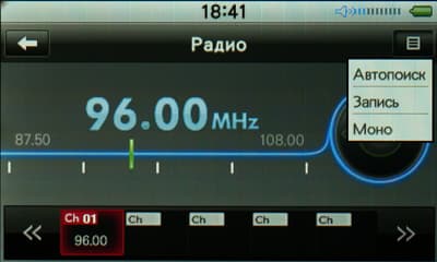 Здесь плеер может похвастаться не только стандартной возможностью автоматиеского поиска с занесением в память первых аж 35-ти найденных радиостанций, но и записью с радио в формат WMA. Причем не просто так «записью», а еще и записью по таймеру, но об этом пункте поговорим подробнее в главе «Часы», она производится именно оттуда. А если необходимо просто записать именно сейчас — для этого есть контекстноме меню, которое поможет также сменить стереорежим на моно, а также активировать автопоиск станций.