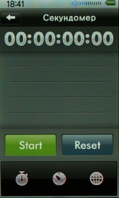 Секундомер достаточно продвинутый: ведет отсчет с точностью до миллисиекунд, можно делать до 100 засечек, которые выстраиваются в удобный список.