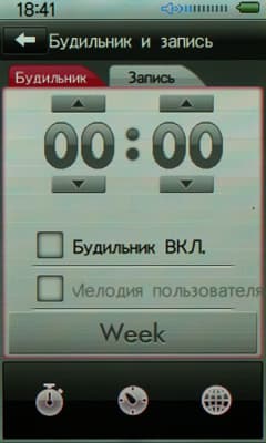 И самое инетесное — «Будильник и запись». Будильник может выдавать сигнал только через наушники, никаких «пищалок» внутри корпуса, видимо, нет. Может проигрываться как стандартная выводящая из себя по утрам мелодия, так и заданная пользователем композиция. Галочками можно отметить дни, в которые следует вас будить.