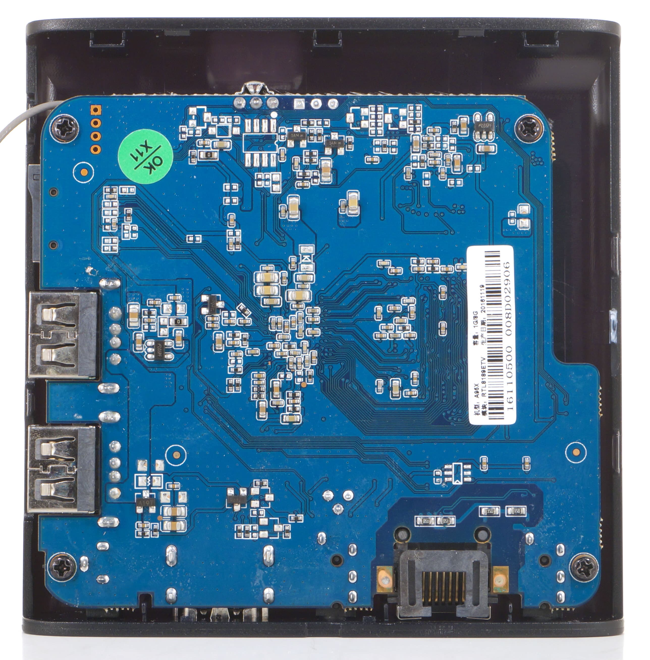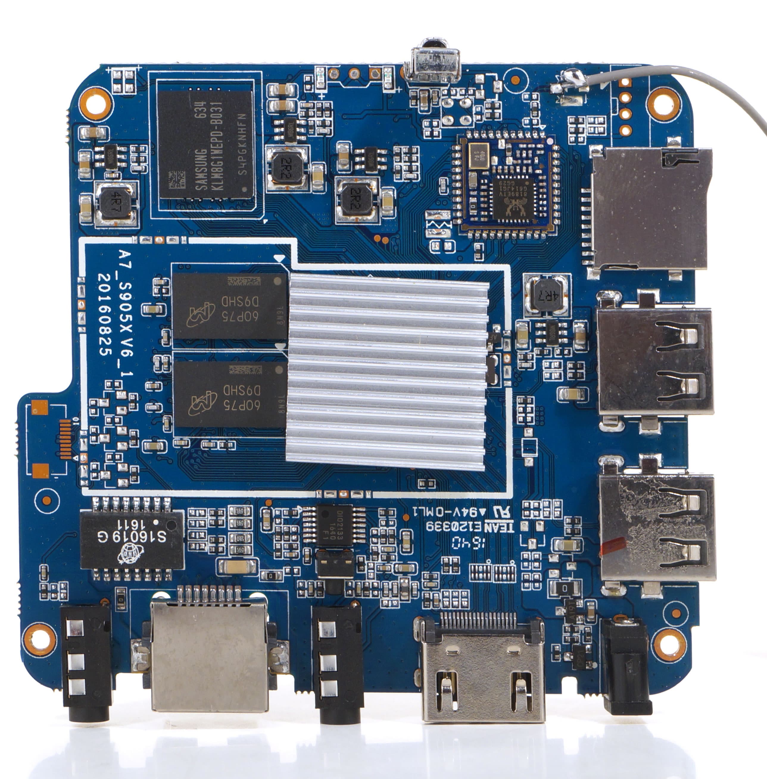 Помимо накрытой радиатором SoC Amlogic (Cortex A53-ARM8), на плате можно разглядеть некоторые электронные компоненты:
