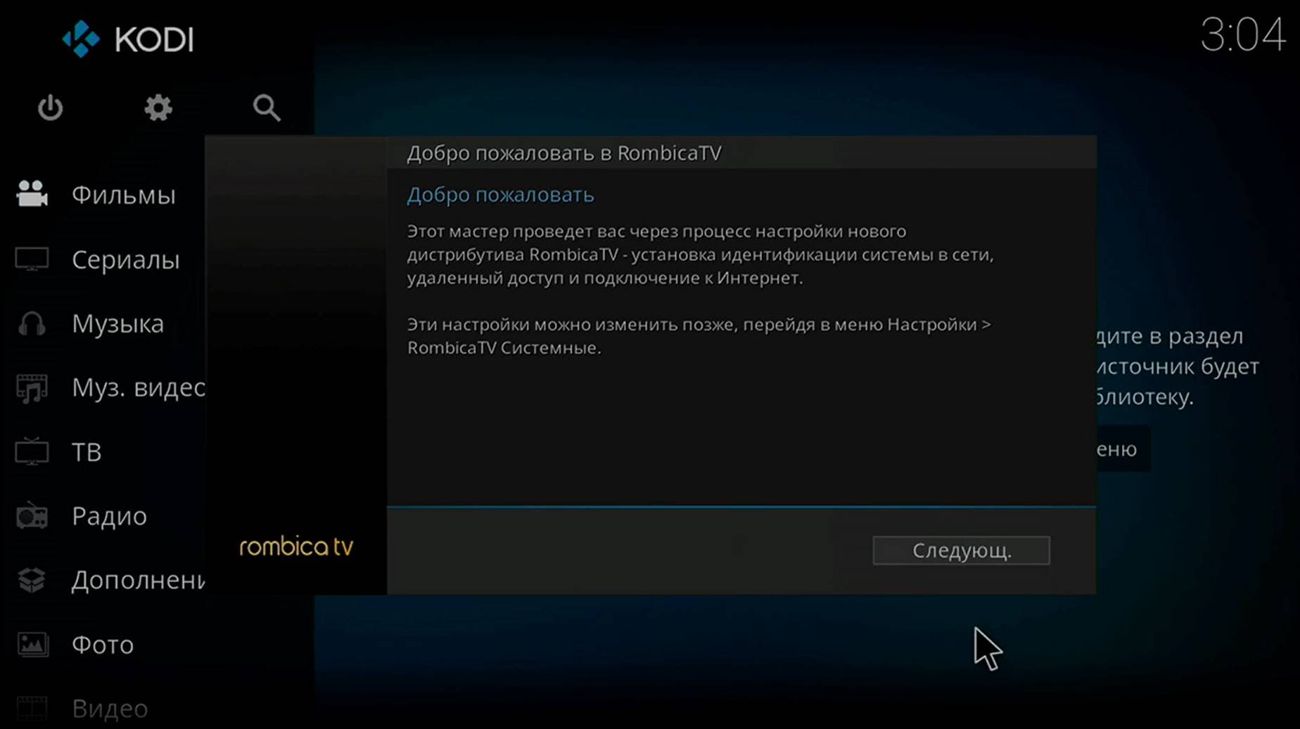 Система приветствует пользователя экраном мастера настройки. Если не игнорировать его и пройти эти несколько простых шагов, то впоследствии вряд ли понадобится возвращаться к отладке. Разве что если пользователь привередлив или желает установить какие-то дополнительные модули, стандартные для оболочки Kodi.