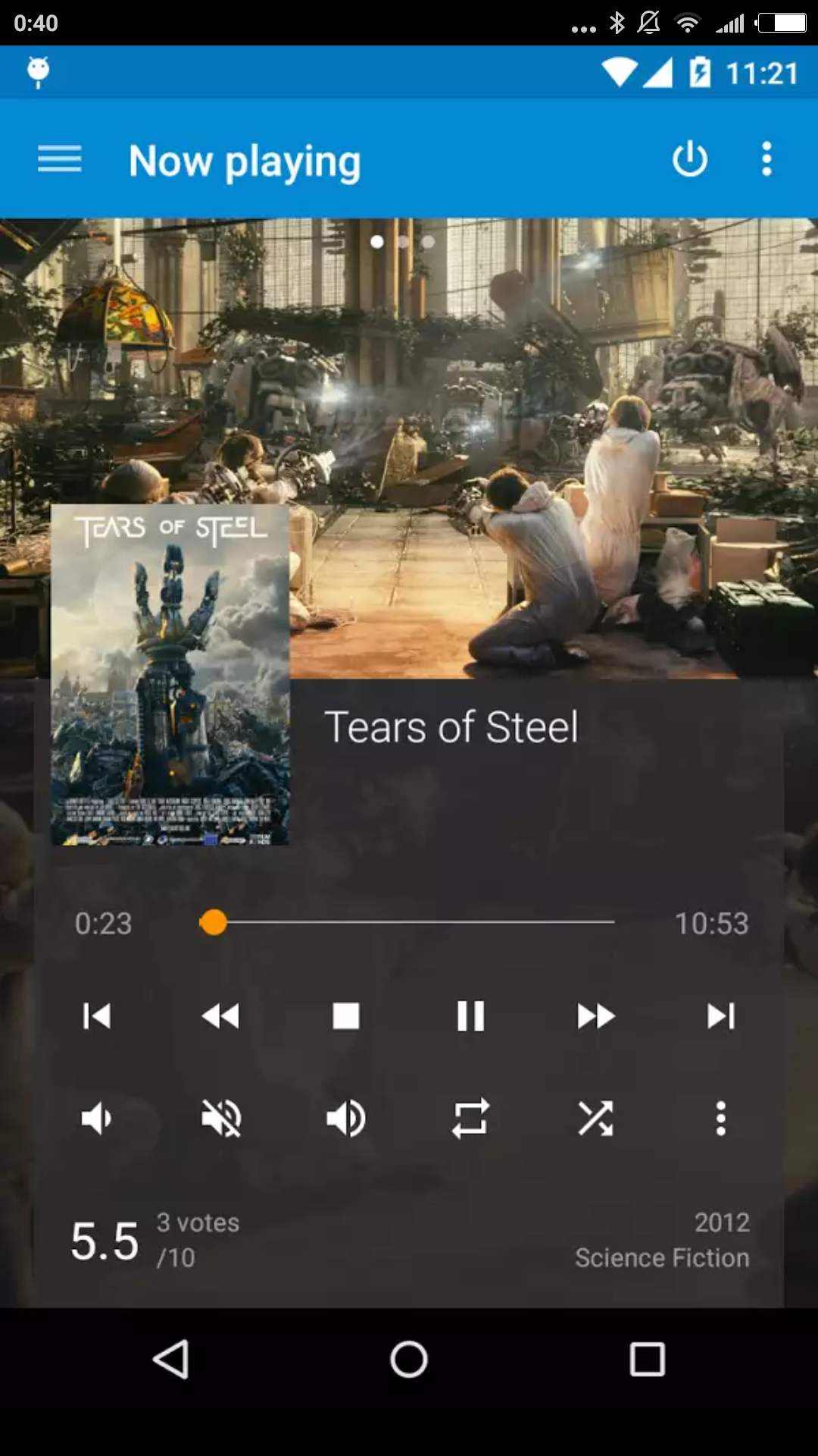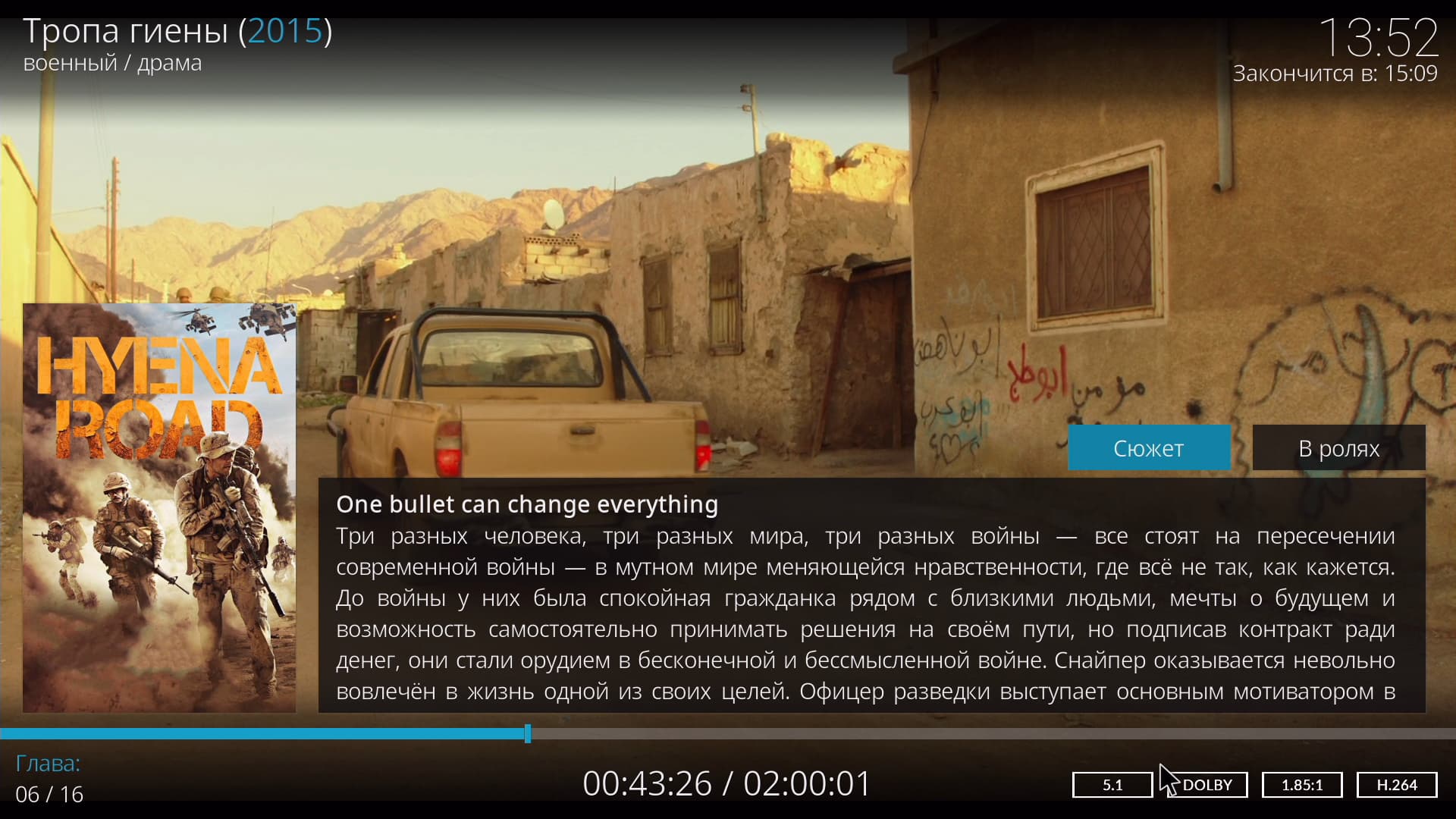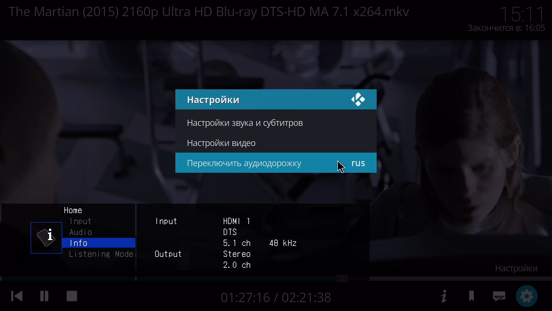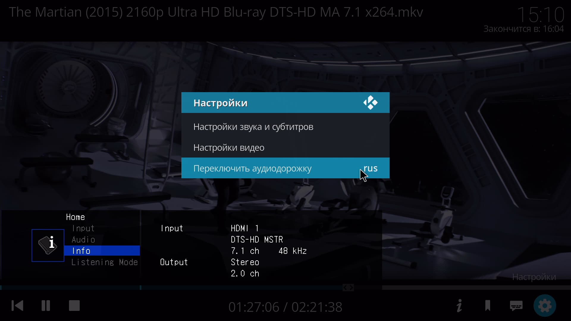 Процесс воспроизведения видео был продемонстрирован выше, остается лишь отметить, что во время проигрывания на экран может быть выведена полная информация о фильме и технических свойствах файла. Также, непосредственно во время просмотра, можно выбрать другую звуковую дорожку, оперативно переключить способ вывода звука.