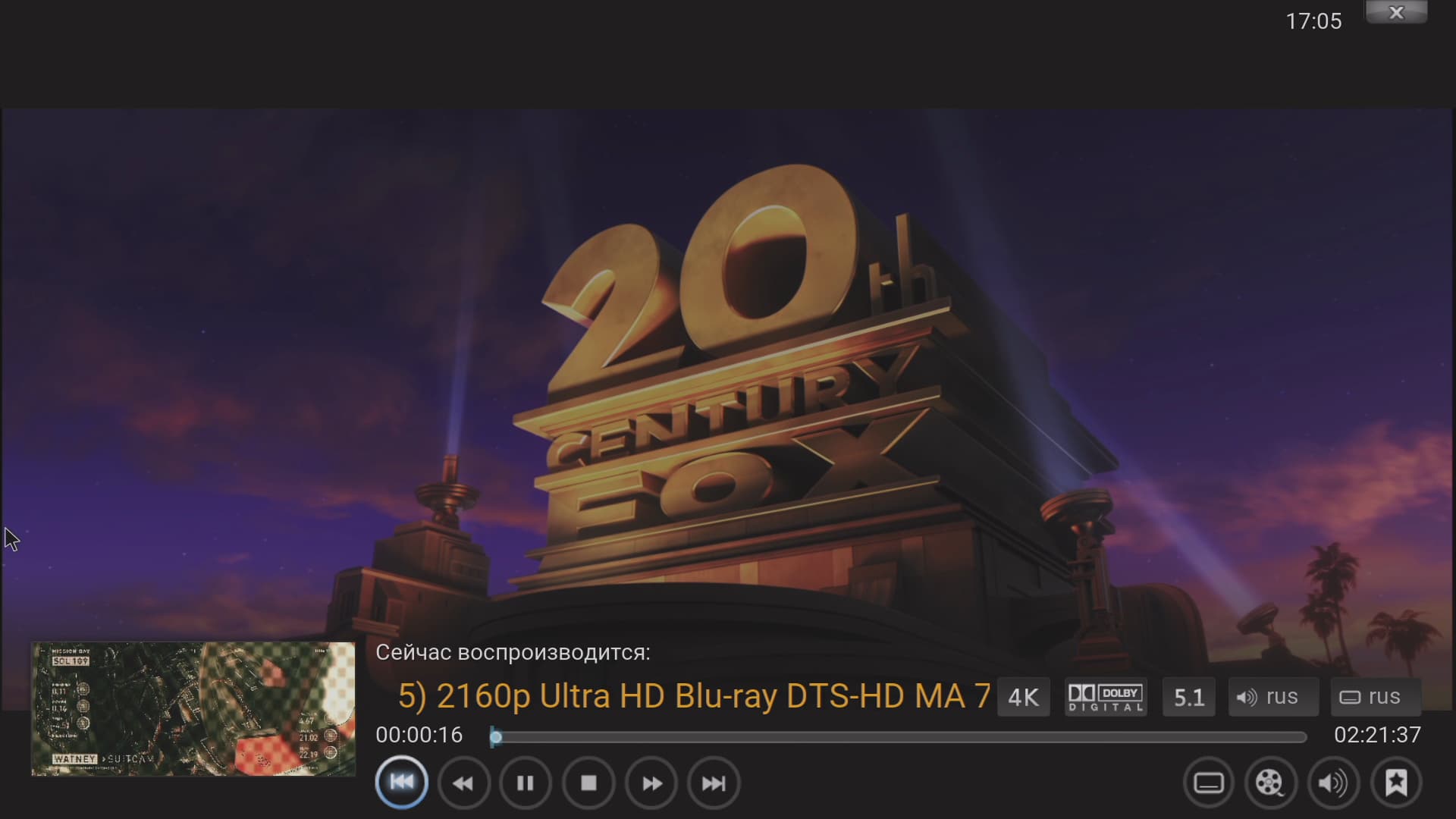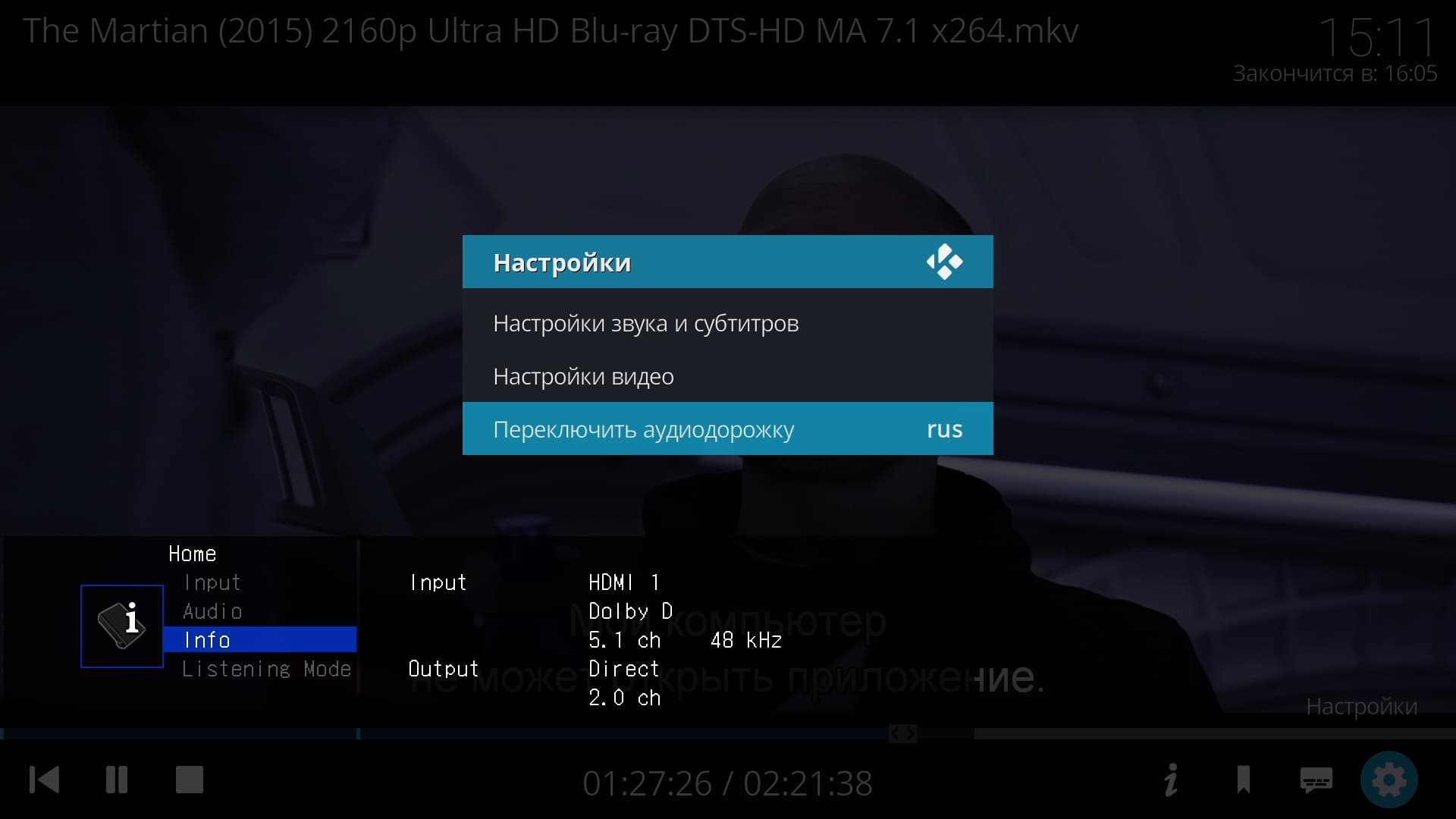 Кстати, о звуке. При воспроизведении под Android прямой вывод звука DTS Master Audio оказывается невозможен. Но плеер, работающий под управлением Rombica TV OS, свободен от Android-ных предрассудков, эта операционная система имеет прямую связь с электронными компонентами, без посредника в виде Java-машины. В результате с выводом многоканального или HD-звука нет абсолютно никаких проблем. Ниже представлены скриншоты экрана плеера с информационным дополнением от аудиоресивера, где приводятся сведения о формате поступающего звука.