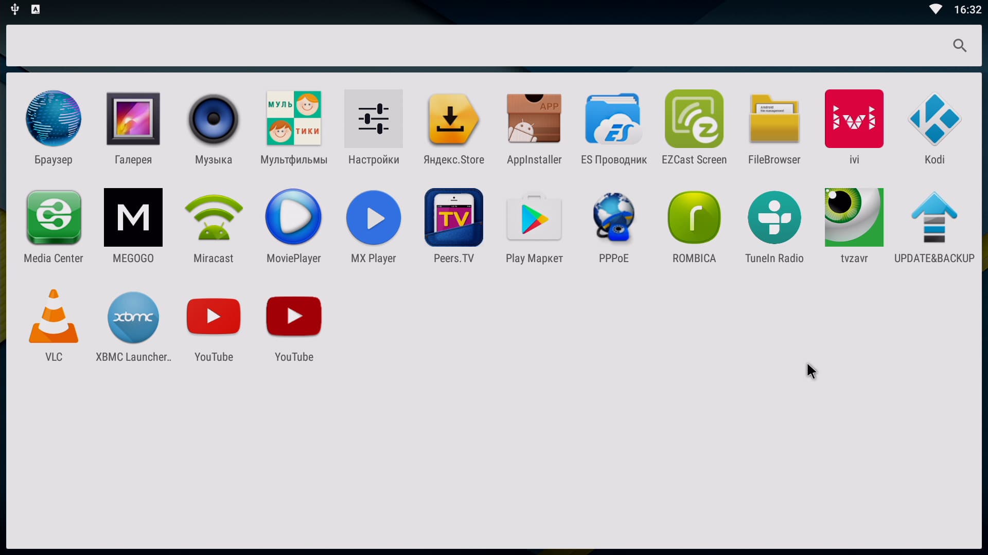 Загрузка операционной системы занимает стандартные для Android несколько десятков секунд. Оболочка в рассматриваемом плеере — самая обыкновенная, привычная каждому владельцу Android-смартфона или планшета. Мы же не менее привычно отметим, что такой интерфейс мало годится для использования в гаджете, который не имеет сенсорного дисплея. Требуется либо подключить мышку, либо воспользоваться специальной кнопкой на пульте ДУ. Эта кнопка активирует ползающий по экрану курсор, которым можно управлять с этого же пульта, нажимая на кнопки со стрелками. Медленно и неудобно, однако в качестве горячей замены отсутствующей мышке подходит неплохо.