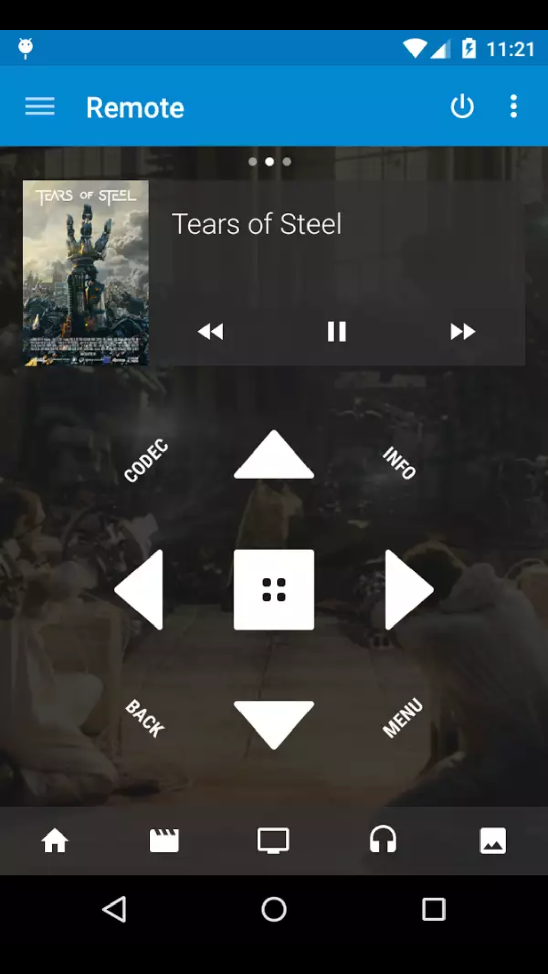 Механические кнопки на корпусе отсутствуют, все управление производится только с пульта ДУ либо посредством периферии, подключенной к USB портам плеера. Также можно задействовать управление с помощью мобильных устройств по беспроводной локальной сети с помощью универсального приложения (версия для Android), но работает оно только под оболочкой Kodi.