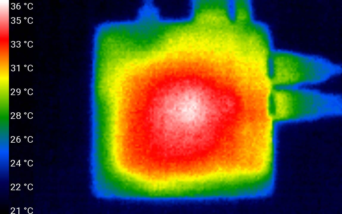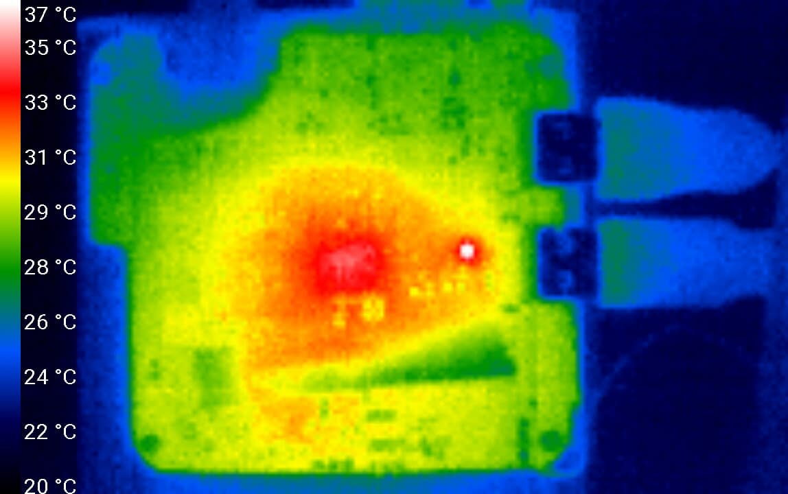 Вся эта начинка дает в работе довольно скромный нагрев. Мы сфотографировали тепловизором работающую приставку, которая несколько часов была занята беспрерывным воспроизведением 4K-фильмов в формате H.265. Тестирование производилось в помещении при комнатной температуре около 25 °C. Можно видеть, что один из участков корпуса нагрелся всего лишь до 38 °C. Нетрудно догадаться, что это за участок.