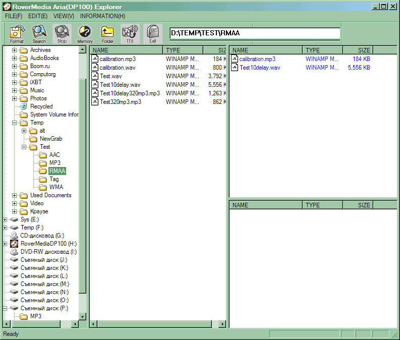 А вот собственная программа форматирования вполне может пригодиться — плееры работают только с FAT16, а штатными средствами можно ненароком форматнуть память и под FAT32. Для подобных случаев или нейтрализации последствий аппаратных сбоев и предназначена данная программа. Кстати — очень она мне напомнила протестированные год назад плейдрайвы. Подробное изучение вопроса показало, что обе модели действительно используют контроллер от SigmaTel, правда (по крайней мере, судя по более высокой скорости) обновленной версии.