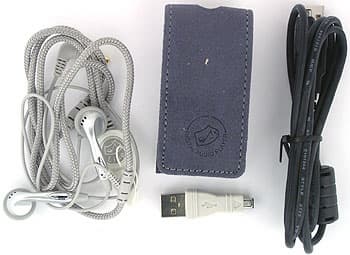 Комплект поставки ничего интересного собой не представляет: обычный CD с ПО, USB-кабель, наушники (стандартного для плееров невысокого качества), пластиковый шнурок для ношения плеера на шее, да тканевый мешочек. Как показала практика общения с другими устройства, польза от него близка к нулю.