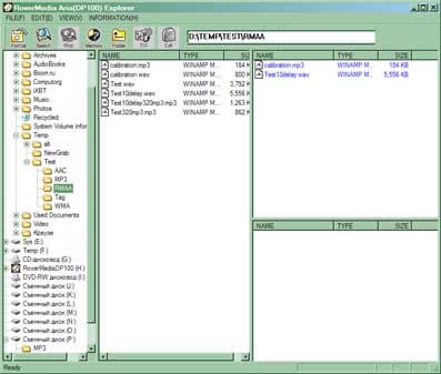 Официально плееры поддерживают MP3 и WMA-файлы, что тестирование и подтвердило. С обязательным набором оба устройства справились безукоризненно: никаких проблем с каким-либо сочетанием параметров не возникло. Отлично воспроизводятся файлы разных версий, с разными частотами дискретизации и битрейтом. И если полной поддержкой MP3 сейчас уже никого не удивишь, то вот умение нормально обращаться с WMA 48 кГц, например, до сих пор не стало стандартом. Так что за этот пункт и DP100FM, и DP200FM заслуживают высочайшей оценки.