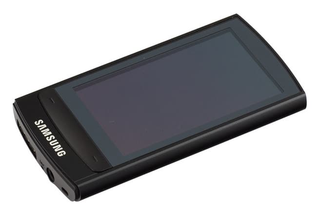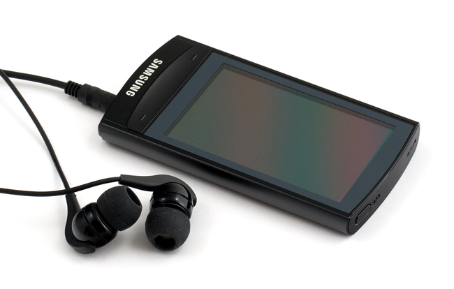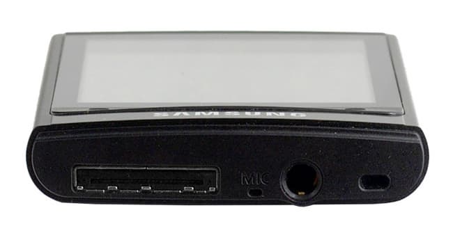 На лицевой панели расположен сенсорный дисплей, а под ним — кнопка-качелька. На нижнем торце — два гнезда: одно для наушников, другое — для соединения с ПК. Последнее уже не в первый раз нам встречается в плеерах Samsung и не только. Там же расположено ушко для шнурка и встроенный микрофон.