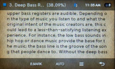 В данном плеере используется сенсорный TFT-дисплей с разрешением 400*240 точек, в диагонали 2,6”. Соотношение сторон 16:10 позволяет с комфортом смотреть широкоформатные фильмы и ролики, площадь, занимаемая черными полосами, либо совсем равна нулю, либо минимизируется по сравнению с «обычными» экранами 4:3.