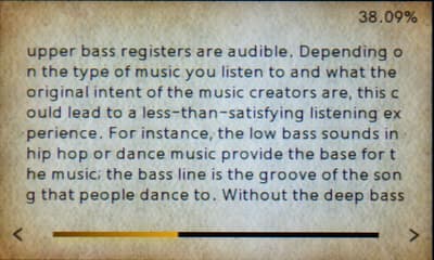 Получается как бы стопка книг с названиями файлов на корешках. Сам просмотрщик текста не блещет обилием настроек. Внизу присутствует полоса прогресса, которую нельзя убрать. Настроить можно только фон, да и то на выбор предоставляется только три комбинации «цвет фона — цвет текста», и размер шрифта (он может быть малый, средний и большой). Есть также возможность делать закладки.