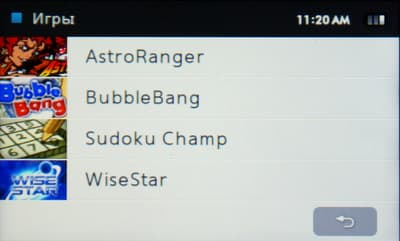 В категории Игры присутствует четыре игры. Все они незамысловаты. В одной нужно, будучи супергероем, сбивать летящее «нечто», причем в такт музыке, в другой лопать виртуальные пупырчатые упаковочные пакеты, третья — судоку, в четвертой надо объединять одинаковые картинки (в данном случае планеты), которые потом исчезают и на их место приходят новые. Все игры, кроме последней, нормально управляются при помощи сенсорного экрана.