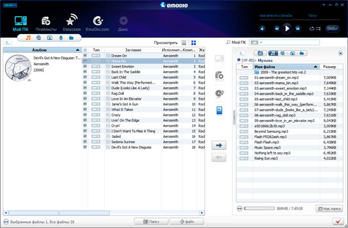 Плеер соединяется с ПК по протоколу UMS, то есть определяется системой как съемный диск, никакие программы не требуются. Но она есть, это все та же программа EmoDio. С ее помощью можно записывать музыку в память плеера, скачивать RSS-каналы, которые потом можно перенести в плеер, составлять плейлисты, копировать музыку с музыкальных CD, и так далее.