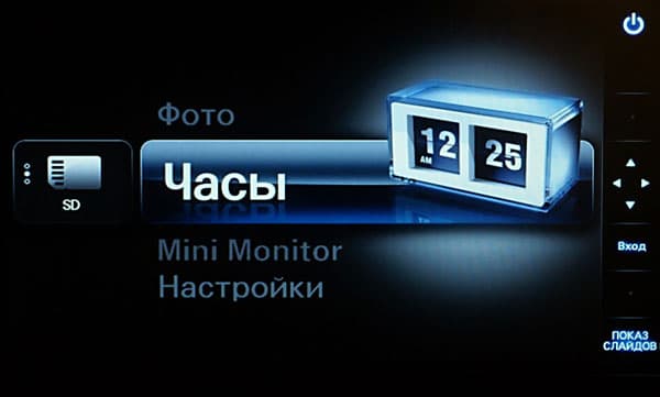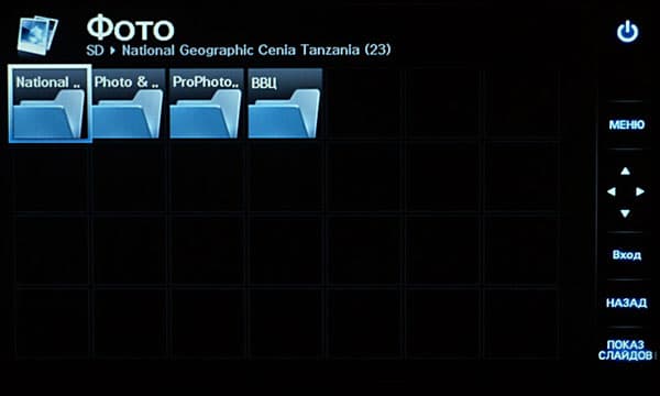 Фотографии можно смотреть как из встроенной памяти, которая составляет 1 гигабайт, так и со съемных носителей — USB-флэшки или SD/ SDHC карт памяти. В главном меню есть удобная возможность переключить текущее расположение фотографий.