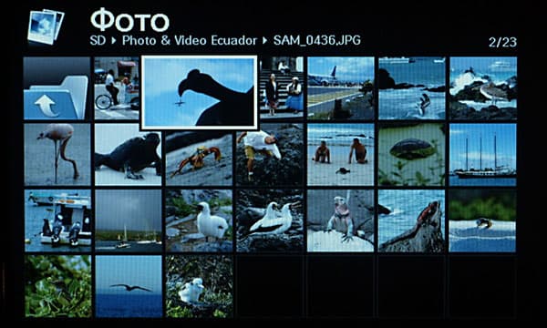 Фотографии не разбиваются на какие-то альбомы и прочее — при входе в режим «Фото» отображаются обычные папки. Картинки отображаются в виде превью-изображений, благодаря этому можно быстро найти нужный снимок.