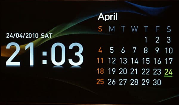 Если вам подарили фоторамку, а она вам не нужна, то можно попробовать использовать ее как обыкновенные электронные часы. Они могут отображаться как отдельно, так и с календарем. Часы смотрятся очень красиво, в этом можете убедиться, посмотрев на скриншоты. Жаль, что рамка не снабжена никаким динамиком-пищалкой, следовательно, нет и функции будильника.