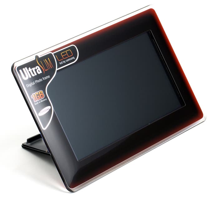 Рамка преподносится как ультра-тонкая. Ее толщина составляет 23 миллиметра. Казалось бы, ничего супертонкого, но прошлые модели Samsung были толще. Рамка целиком пластиковая. Окантовка у нее прозрачная, и когда через нее проникает свет, создается приятный эффект. Поначалу кажется, что основная часть черная, непрозрачная. На самом деле она темно-красного цвета, это тоже вносит свою изюминку, когда сзади проникает свет. Устройство напоминает собой "аналоговые" рамки для фотографий.