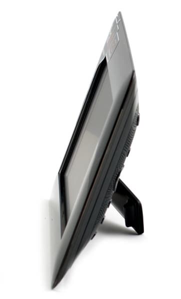 Об этой подставке надо сказать пару слов. Во-первых, она позволяет установить рамку лишь под совсем небольшим наклоном, большой свободы в этом плане нет. В вертикальном положении рамка стоит достаточно шатко, хотя, впрочем, для такой стойки она и не предназначена (ориентация экрана не настраивается). Во-вторых, эта подставка достаточно хлипкая, не следует ее крутить туда-сюда по многу раз.