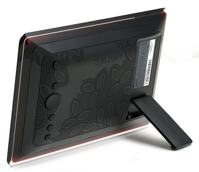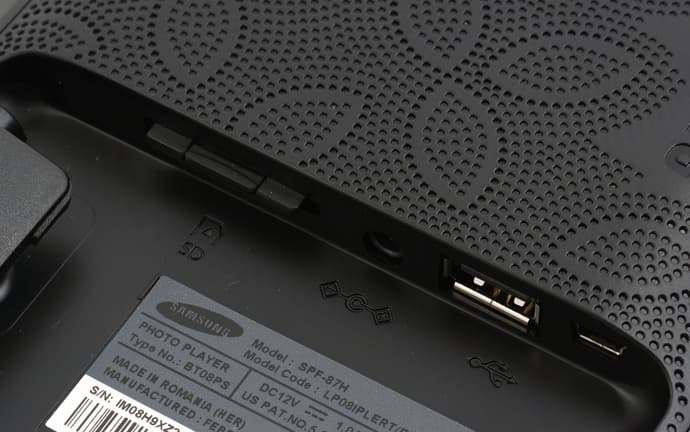 Все кнопки рамки расположены по традиции сзади, дабы не портить внешний вид передней панели. Там же находятся и все гнезда: слот для карт памяти формата SD, гнездо для USB-флешек, гнездо mini- USB для соединения с компьютером, гнездо для бока питания. В специальном углублении прячется подставка, которая может крутиться.