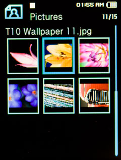 Среди возможностей плеера нашлось место и демонстрации фотографий. Формат — только обычный (не прогрессивный) JPEG, ограничения на размер официально нет (на практике фотографии с 6МР-цифромыльницы плеер переваривал, во всяком случае, прекрасно). С масштабированием изображения под размер экрана плеер справляется достаточно шустро, существуют три уровня «увеличения» (таковым оно будет, конечно, только для оптимизированных для размера экрана изображений): 100, 200 и 400%; в последних двух случаях возможно перемещение «окна» (физического дисплея) по всему изображению. Есть также возможность устроить слайд-шоу, в том числе и под музыку. Слишком серьезно рассматривать данную возможность не стоит, поскольку дисплей мелковат. По-прежнему. С другой стороны, он лучше, чем на большинстве плееров (кроме «заточенных» под видео), а и с помощью последних иногда можно друзьям интересные картинки продемонстрировать. Тут даже о фотографиях можно начинать говорить :)