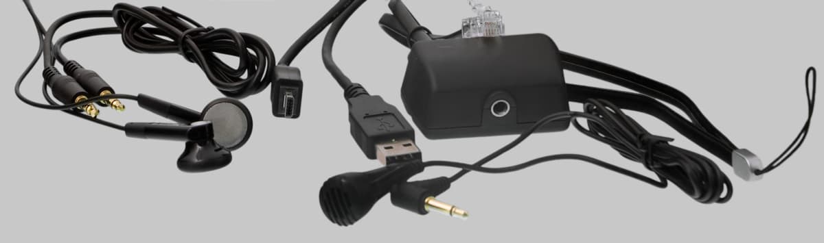 Адаптер для записи телефонных переговоров тоже был проверен — работает. В комплекте есть для него линейный кабель с двумя «джеками» на концах, один вставляется в диктофон, в гнездо линейного входа, другой — в адаптер. Сама коробочка включается последовательно в телефонную сеть и никаких проблем не создает.