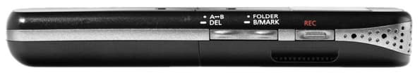 Вместе с ней на правом торце находятся еще две клавиши: первая — для установки закладки и смены директорий для записи, вторая — для зацикливания участка записанного файла и удаления из памяти ненужных файлов. Каждая кнопка может использоваться по двум разным назначениям, в зависимости от включеной в данный момент функции. Благодаря этому устройство не перегружено лишними кнопками на боковой панели.