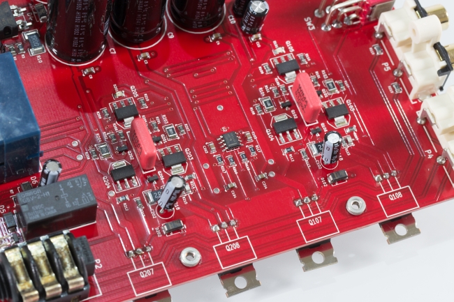 Усиление выполнено в несколько каскадов. Видны красные конденсаторы Wima.