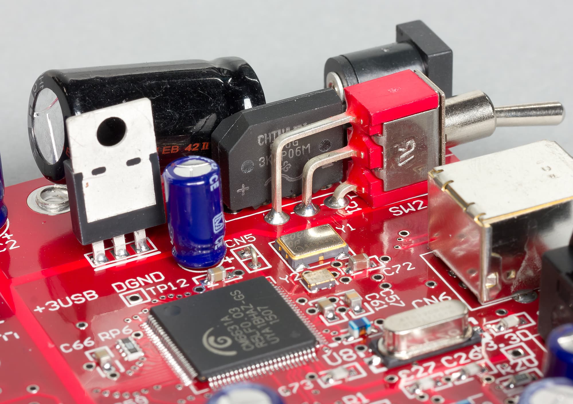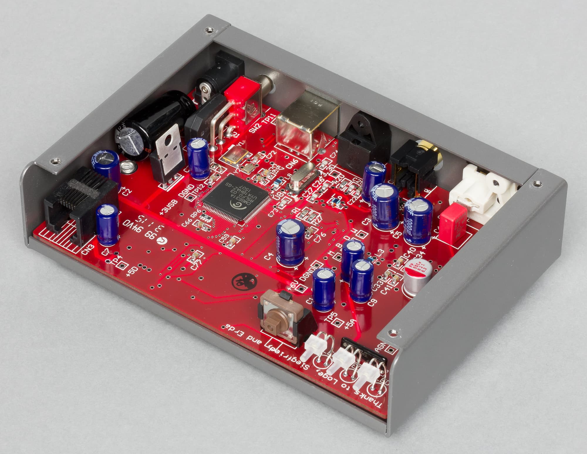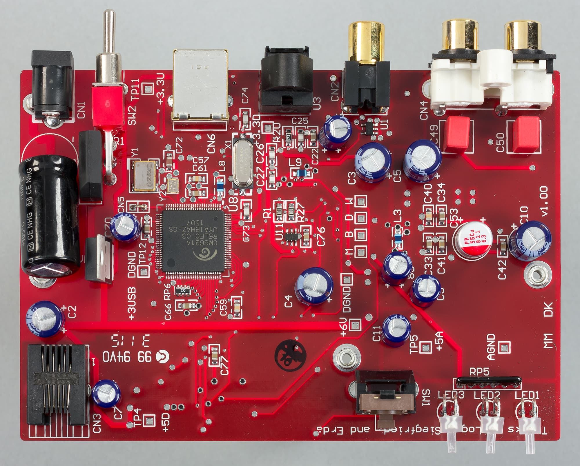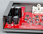 Как уже отмечалось, аппарат удивляет малыми размерами, но никакой дискриминации в коммутации нет. На борту входы: USB 2.0, оптический (Toslink), коаксиальный (RCA), причем все интерфейсы поддерживают до 24 бит/192 кГц. Блок питания — внушительных размеров и весит больше самого аппарата. Корпус устройства полностью стальной (прикрепленная к шасси Г-образная крышка). На передней панели одна кнопка, последовательно переключающая 3 входа и 3 светодиода лунно-белого цвета для индикации выбранного входа. Тумблер включения находится сзади, при таком миниатюрном размере аппарата это не вызывает никаких неудобств.