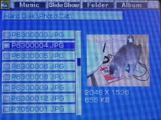 Полноценный двухоконный файловый браузер — собственно, одной этой фразой можно и ограничиться :) Окна неравноправны — копировать информацию можно только слева направо, хотя ограничением это назвать сложно, поскольку с любой стороны может быть открыт любой каталог что встроенного винчестера, что карты памяти. Файлы можно переименовывать, но использование для этой цели экранной клавиатуры сложно назвать удобным. Впрочем, не факт, что эта операция вообще будет сильно нужна: тому, что записывается с компьютера, можно сразу присвоить осмысленные имена, а все, что создается самим комбайном (каталоги при копировании с карт памяти, плейлисты или файлы альбомов), благодаря наличию встроенных часов, получают уникальные имена автоматом (в зависимости от времени создания) так что в необходимость в переименовании способна возникнуть нечасто.