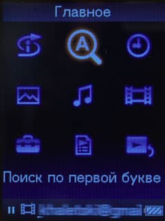Меню состоит из девяти значков, расположенных в три ряда: Произвольное воспроизведение, Поиск по первой букве, Дисплей часов, Музыка, Библиотека видео, Настройка, Списки воспроизведения, Текущая композиция. Эстетическая сторона меню вполне хороша — легкая, ненавязчивая анимация (а точнее, увеличение выбранной иконки относительно остальных) радует глаз.