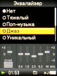 Далее, о настройках звучания. Во-первых, стандартные предустановки — их всего 4 штуки, а два можно настроить вручную. Он пятиполосный, позволяет поднимать/опускать частоты 400 Гц, 1 кГц, 2,5 кГц, 6,3 кГц, 16 кГц. Особняком стоит ползунок Clear Bass, отвечающий за самые низкие частоты.