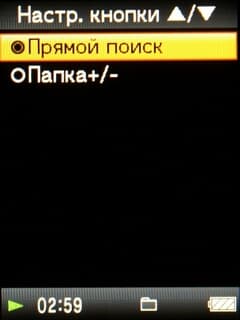 Далее, мы наблюдаем пункт «Настройка кнопки вверх/вниз». Еще одна очень интересная и удобная фишка этого, да и других плееров Sony — во время воспроизведения кнопками вверх/вниз можно выделять имя артиста, год, название альбома, жанр — графы информации из тегов, которые отображаются при воспроизведении на экране. Нажав в нужном месте, можно переключиться к другим композициям либо этого исполнителя, либо к списку песен этого альбома, либо ко всем песням всех исполнителей, выпущенных в этом году, либо то же сделать с жанром. Очень удобно. Это еще одна особенность, которая может ускорить управление плеером. Но работу кнопок вверх/вниз можно настроить на другое действие — переключать папки. Вверх переключает воспроизведение на предыдущую директорию, вниз — на следующую. Тоже очень удобно, но из-за случайных нажатий мы этим режимом не пользовались.