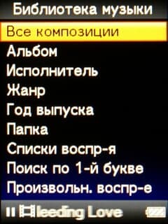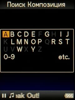 Поиск по первой букве позволяет искать среди исполнителей, альбомов или имен исполнителей, выбрав первую букву. Имеется только английский алфавит и цифры. Русские композиции можно найти, нажав под виртуальной клавиатурой кнопку etc, но смысл всего этого действа сразу теряется — буквы-то ввести не получится, русские названия просто будут в едином списке.