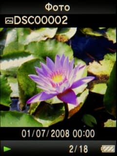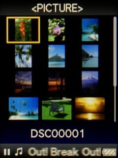 Поддерживаются только обычные JPEG -файлы. Браузер представляет собой матрицу из маленьких превьюшек, по которым можно догадаться о содержании файла. Картинки можно смотреть под музыку, но это стоит делать, отключив в настройках сопровождение нажатий на кнопки специфическим писком. Если его не отключить, то музыка при смене изображений будет «икать», прерываясь на писк, что не очень приятно.