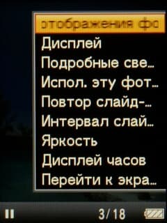 Во время просмотра, к сожалению, никак нельзя управлять воспроизведением музыки, только регулировать громкость, благо для этого предусмотрены отдельные механические кнопки. Нажатие на Play включает/выключает показ слайд-шоу. Время перехода между слайдами настраивается также из контекстного меню. Как и во всех прочих функциях, в контекстном меню есть пункт «Перейти к экрану воспроизведения», что, разумеется, позволяет сразу перейти к воспроизводимой песне.