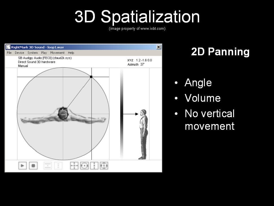 Рассмотрим, как же создается эффект 3D-звука. Начнем с простейшей технологии 2D-панорамирования. Эта технология применялась еще в DOOM от небезызвестных ID Software — все просто: каждый моноисточник звука играется как стерео, а позиционирование создается за счет изменения громкости левого или правого каналов. В такой системе нет вертикального позиционирования, но возможна реализация эффектов, связанных, скажем, с небольшим изменением (фильтрацией высоких частот) звука, когда он находится сзади слушателя, так как в реальности мы слышим слегка заглушенный звук, если он находится за головой слушателя.