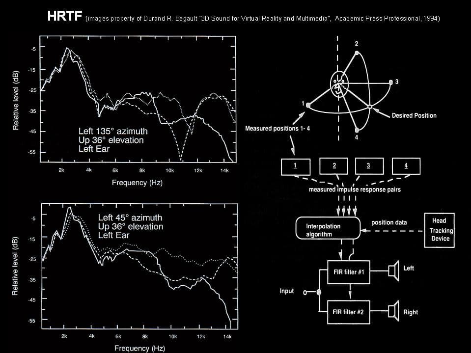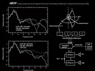 HRTF (Head Related Transfer Function) — это передаточная функция, моделирующая восприятие человеком звука посредством двух ушей для определения местоположения источников в пространстве. Наши голова и туловище являются в некоторой степени препятствием, задерживающим и фильтрующим звук, поэтому ухо, скрытое от источника звука головой, воспринимает измененные звуковые сигналы, которые при "декодировании" мозгом интерпретируются соответствующим образом для правильного определения местоположения источника звука.