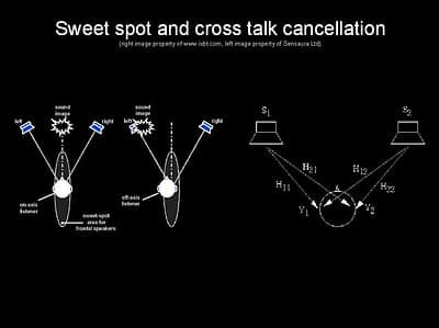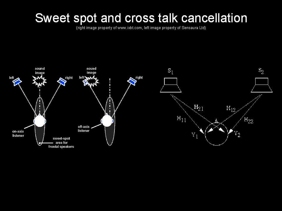 Поэтому, появилось понятие sweet spot, то есть области, при расположении внутри которой слушатель будет слышать все 3D-эффекты, которые он должен слышать. Во всех остальных случаях будут возникать искажения звука, которые будут мешать восприятию. Необходимость выбора правильного положения при прослушивании, то есть расположение слушателя в sweet spot, накладывает дополнительные ограничения и создает новые проблемы. Соответственно, что чем больше область sweet spot, тем большую свободу действий имеет слушатель. Поэтому разработчики постоянно ищут способы увеличить область действия sweet spot.