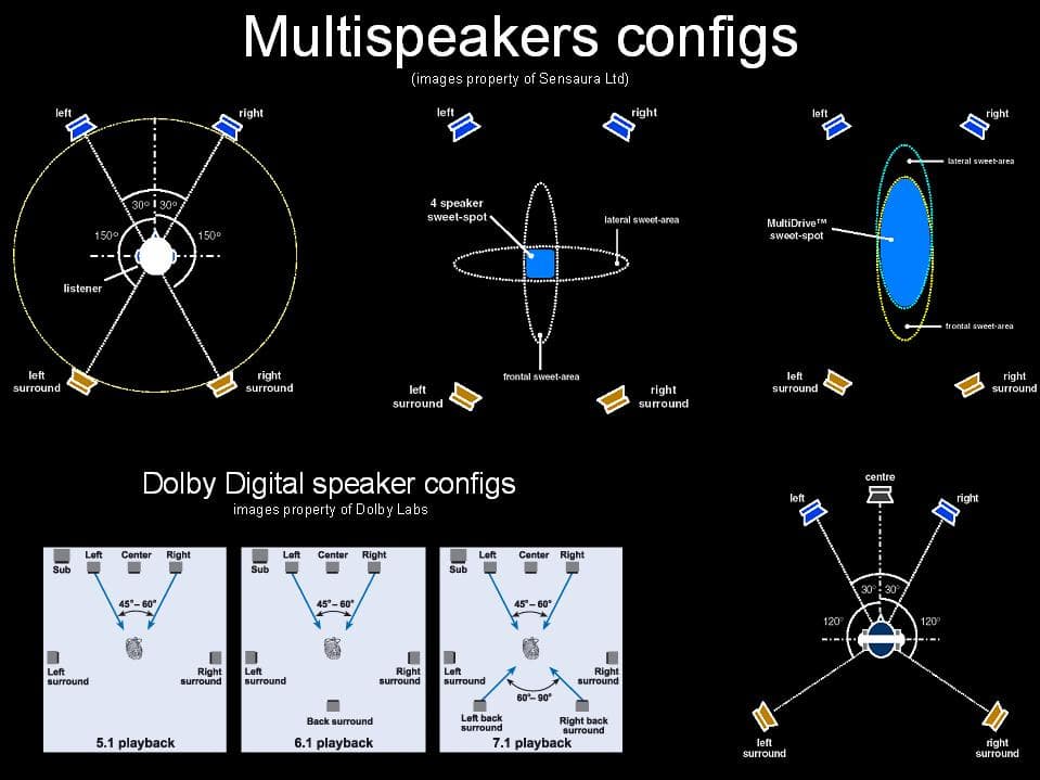 Не стоит забывать и о больших объемах вычислений при расчете HRTF и СС для четырех колонок. Поэтому, скажем, компания Aureal, использовала технику панорамирования на тыловых колонках. Объясняется это именно отсутствием строгих ограничений на расположение тыловых колонок в пространстве.