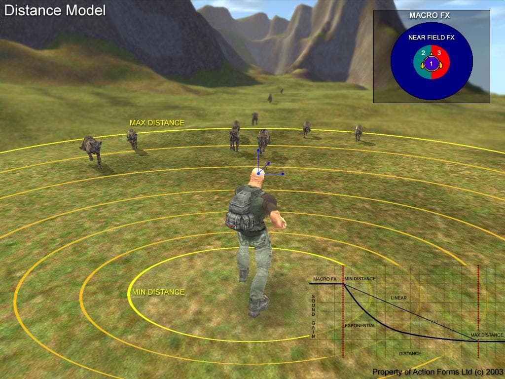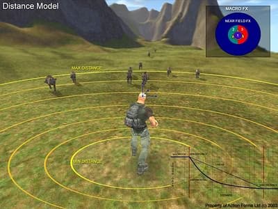 Одной из основных фич звукового движка являются дистанс-эффекты. Чем дальше источник звука удаляется от слушателя, тем тише он становиться. Рассмотрим некоторые модели, которые используются в современных системах. Об одной, самой простейшая, мы уже упоминали — это просто уменьшение громкости в зависимости от расстояния: звуковой дизайнер должен задать некую относительную дистанция (Минимальную), после преодоления которой интенсивность звука начнет затухать. Пока источник находиться в переделах Минимальной дистанции, он только меняет положение, но никаких дистанс-эффектов не происходит, но после её прохождения звук теряет половину интенсивности (-6 дБ) при удалении на каждый метр от Минимальной Дистанции. Звук будет продолжать затухать, пока не достигнет определенной Maximum distance. Это означает, что звук очень далеко, чтобы быть слышимым. После достижения этого порога звук продолжает затухать до нулевой громкости, но, в принципе, такие звуки можно отключать, чтобы не занимать лишних ресурсов. Чем дальше Maximum distance, тем, соответственно, дольше источник будет слышимым.