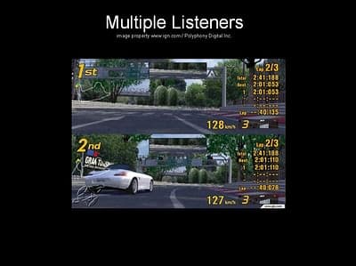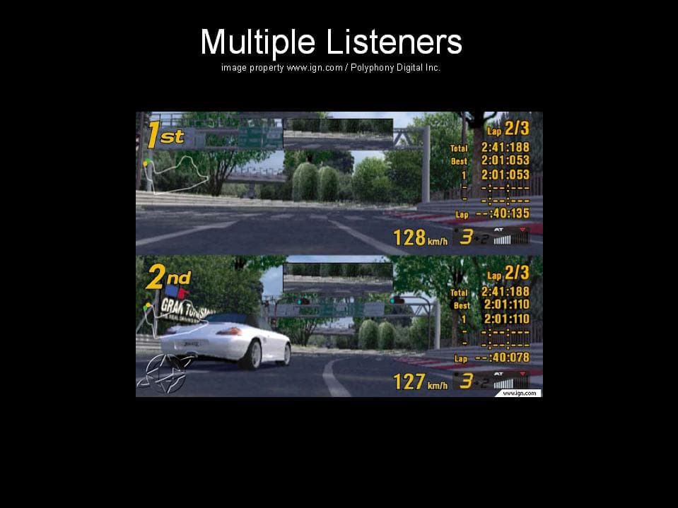 Multiple Listeners — совершенно новая технология, обусловленная появлением игровых консолей (PlayStation 2, Xbox, GameCube) и игр для них с двумя или более игроками, играющими одновременно. В качестве примера — Grand Turismo 3 (Polyphony Digital Inc.) на игровой TV-приставке PlayStation 2. Оба игрока играют на разных машинах, соответственно, находятся в разных частях игрового мира и по идее должны слышать только те звуки, которые их окружают. Конечно, они оба одновременно слышат звуки друг друга, но эта технология заметно упрощает реализацию. К сожалению, не один современный (аппаратный) API не поддерживает Multiple Listeners. Описываемая технология есть только в одном коммерческом звуковом API — FMOD. Более подробно об этом читайте чуть ниже.