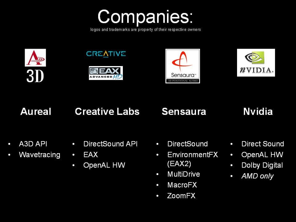 Примерно в 1997-1998 годах в каждая из фирм-производителей чипов выбрали себе технологии, за которыми, как они считали, будущее. Aureal, лидер тогдашнего рынка, пошел по пути создания максимального реализма в играх с помощью Wavetracing. Компания Creative решила, что реализма можно достичь с помощью предрасчитанных ревербераций (пресетов) и выпустила EAX. Creative купила Ensoniq / EMU в 1997, производителя и разработчика профессиональных студийных эффект процессоров — поэтому технология реверберации у них уже была. Когда появилась Sensaura, они взяли за основу ЕАХ, назвали свою версию EnvironmentFX и занялись другими технологиями: MultiDrive, ZoomFX и MacroFX. Всех позже появилась компания NVIDIA (разработчик железной начинки для приставки MS X-Box), воплотившая для позиционирования 3D-звука уникальное real-time аппаратное кодирование в Dolby Digital 5.1.